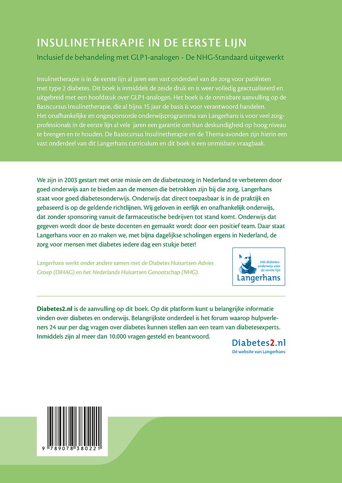 Het onafhankelijke en ongesponsorde onderwijsprogramma van Langerhans is voor veel zorgprofessionals in de eerste lijn al vele jaren een garantie om hun deskundigheid op hoog niveau te brengen en te houden. De Basiscursus Insulinetherapie en de Thema-avonden zijn hierin een vast onderdeel van dit Langerhans curriculum en dit boek is een onmisbare vraagbaak.